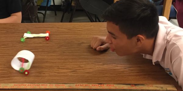 Students test breath-powered vehicles made from lightweight materials. With experiments like this one, I built into my lessons the ability to create innovative ideas and follow through to their own conclusions giving students as much ownership as possible.